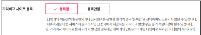· 노출을 희망하지 않을 시 [등록안함]으로 설정 가능하며, 설정 이후 제휴마케팅 채널에 노출되지 않습니다.