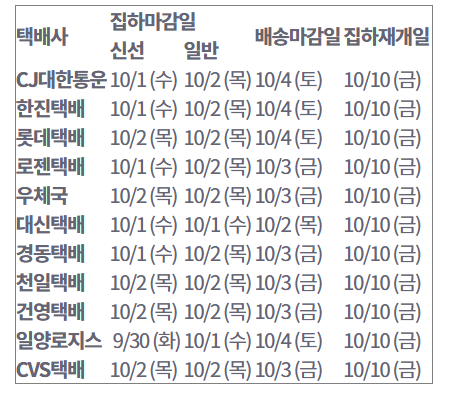 3. 명절 미배송 물량이 많을 경우 택배사 집하재개일 이후 순차적으로 배송될 수 있습니다. 추석 연휴 이후 배송현황도 꼼꼼하게 확인하시어 배송 지연이 없도록 관리해 주시기 바랍니다.