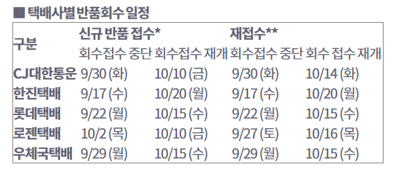 2025년 추석 연휴 기간 택배사별 배송 및 반품회수 일정을 안내드립니다.