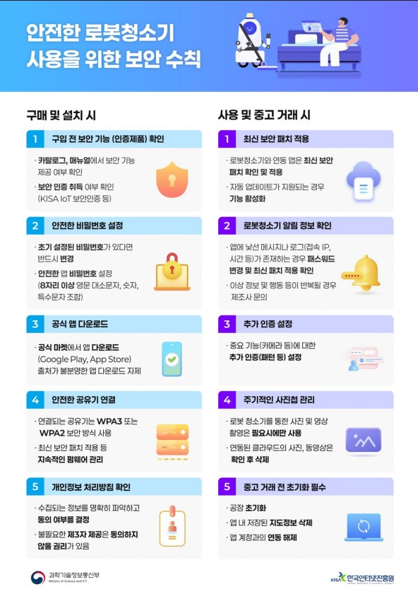 한국인터넷진흥원(KISA)에서 로봇청소기를 포함한 스마트 가전의 보안사고 예방을 위한 수칙을 공개했습니다.