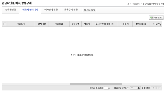 - 주문관리> 입금확인중/예약/공동구매 > 배송지입력대기