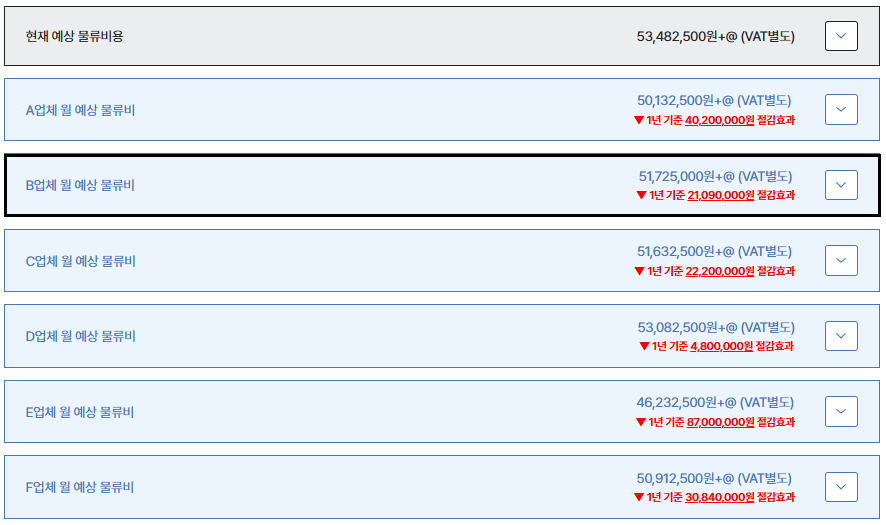 • B업체 전환 후 월 예상 물류비: 51,725,000원