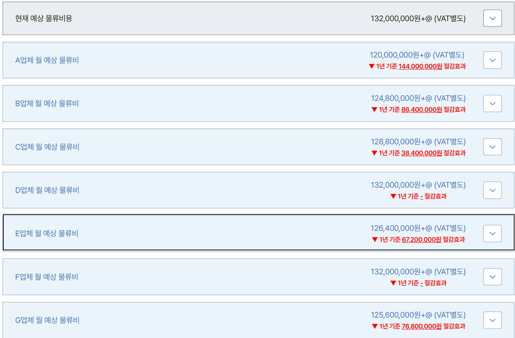 • E업체 전환 후 월 예상 물류비: 126,400,000원