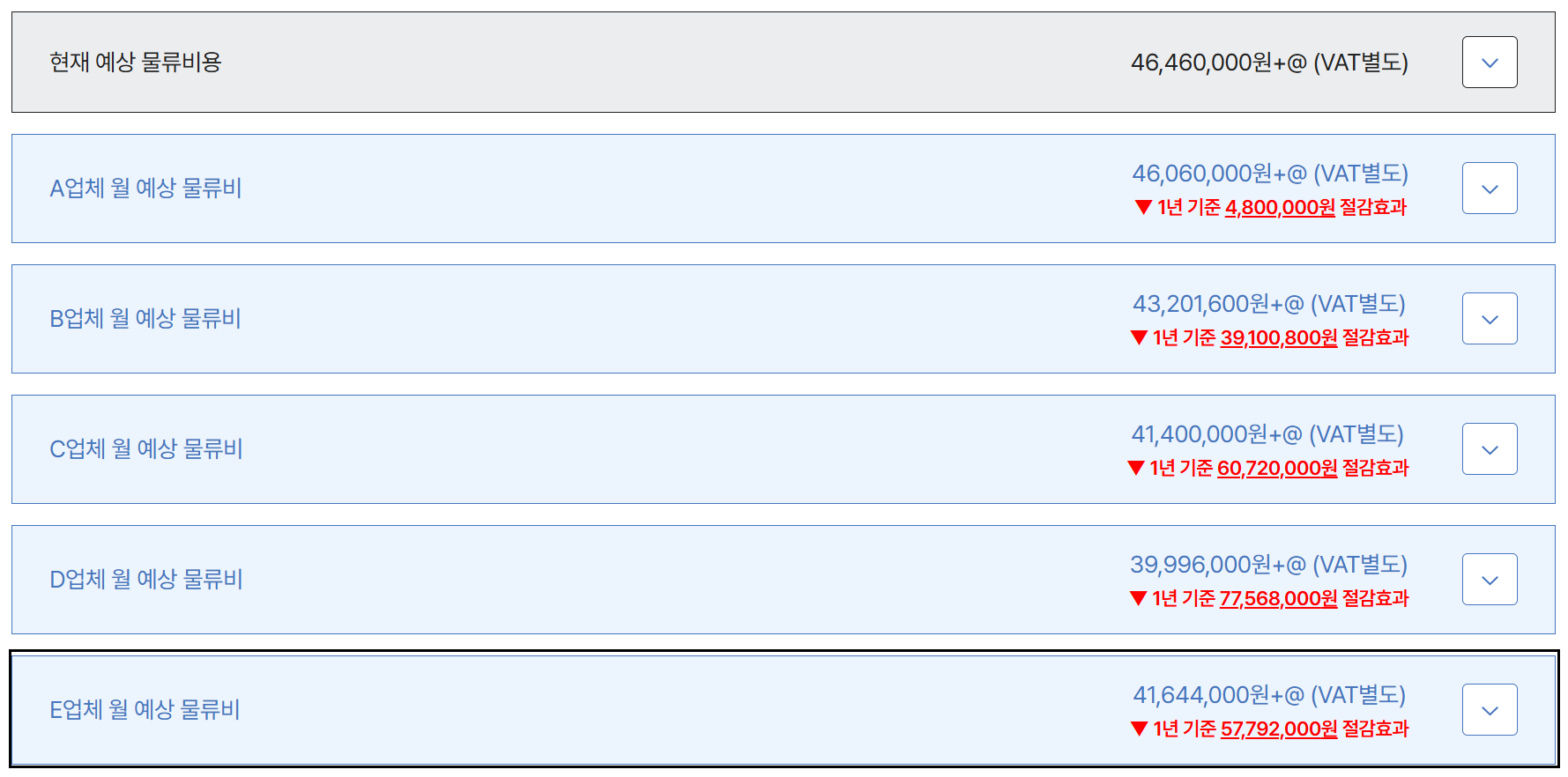이번 전환의 핵심은 서비스 축소나 운영 품질 저하 없이 비용 구조를 재정렬한 점이었습니다. E업체로 이전하면서 반복적인 단가 인상 리스크가 제거되었고, 월별 비용 예측 가능성이 높아졌습니다. 그 결과 연간 물류비 부담을 안정적으로 관리할 수 있는 구조를 확보했으며, 향후 물동량 증가 시에도 비용 관리 측면에서 유연한 대응이 가능해졌습니다.