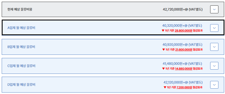 A업체로 전환하면서 박스 규격과 적재 기준이 명확해졌고, 체적 산정 방식이 투명하게 관리되며 불필요하게 부풀려지던 비용이 제거되었습니다.