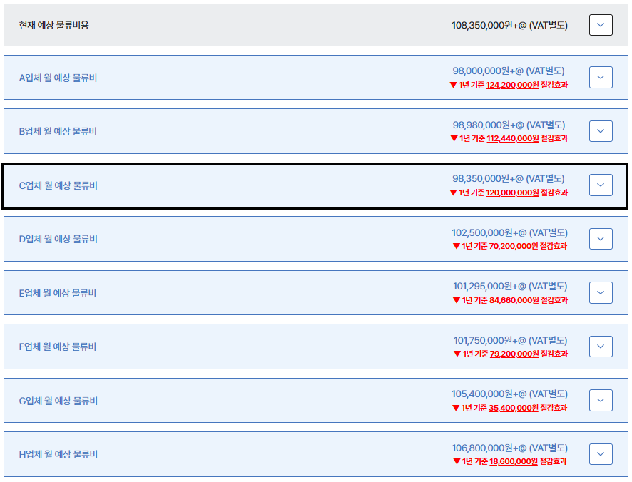 • C업체 전환 후 월 예상 물류비: 98,350,000원